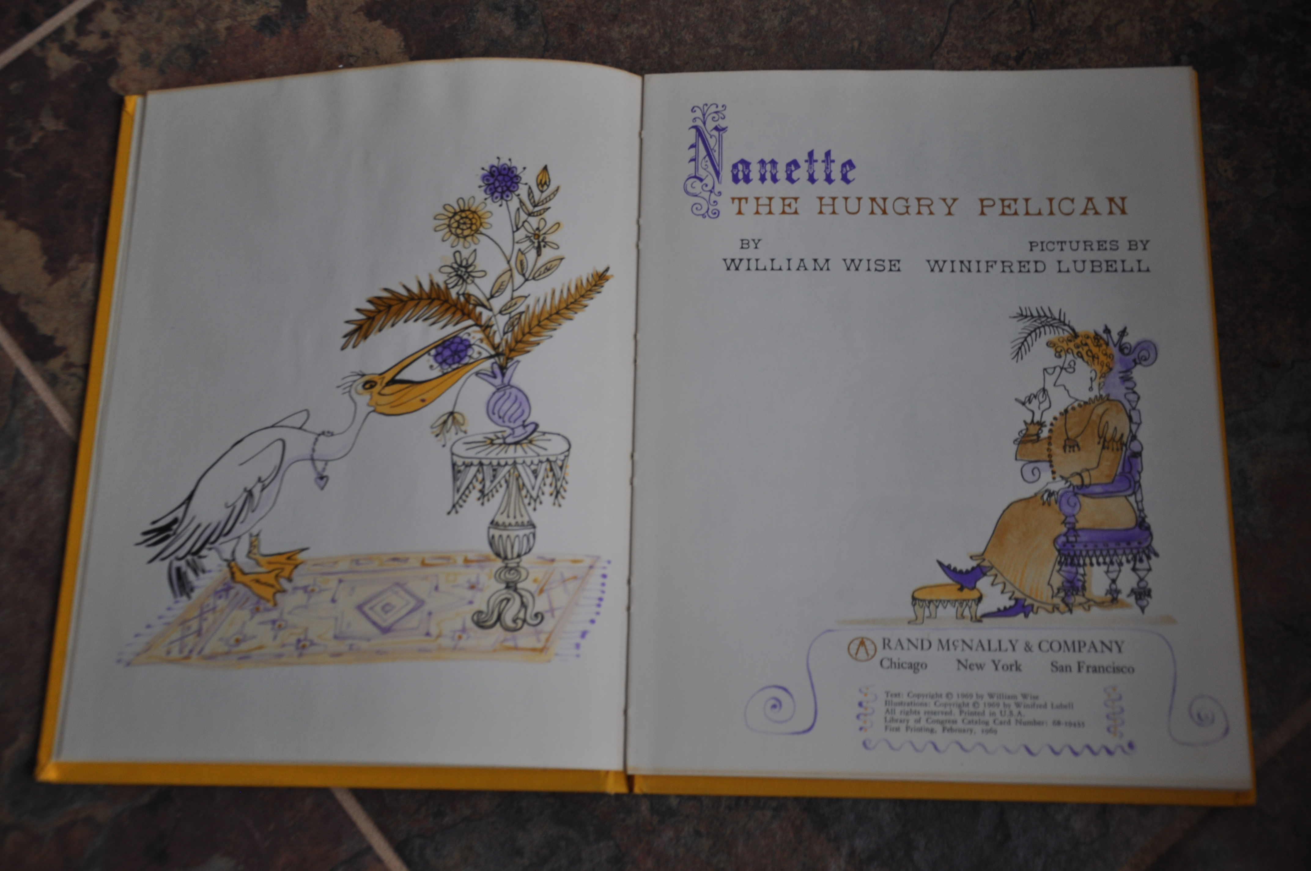 Funny that I picked Nanette just after Rickety Racket Rooster. They have quite a bit in common: both feature an incorrigible bird that eventually saves the day, both published late 60s, both have line illustrations with two color washes*, and (and this is a small detail, but I noticed) both have a piece of art that reacts to the story. Oh, also ROBBERS! My, to have lived in the 60s.
